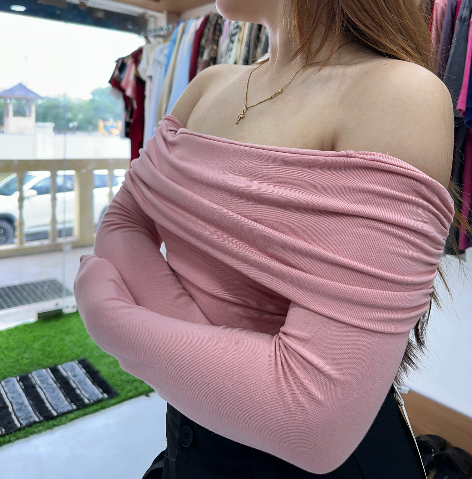 Stay effortlessly stylish with this chic pink off-shoulder top. Designed with soft, stretchable fabric, it drapes beautifully across the neckline for a flattering, feminine look. The fitted long sleeves add elegance, making it perfect for date nights, casual outings, or pairing with high-waist trousers and skirts.