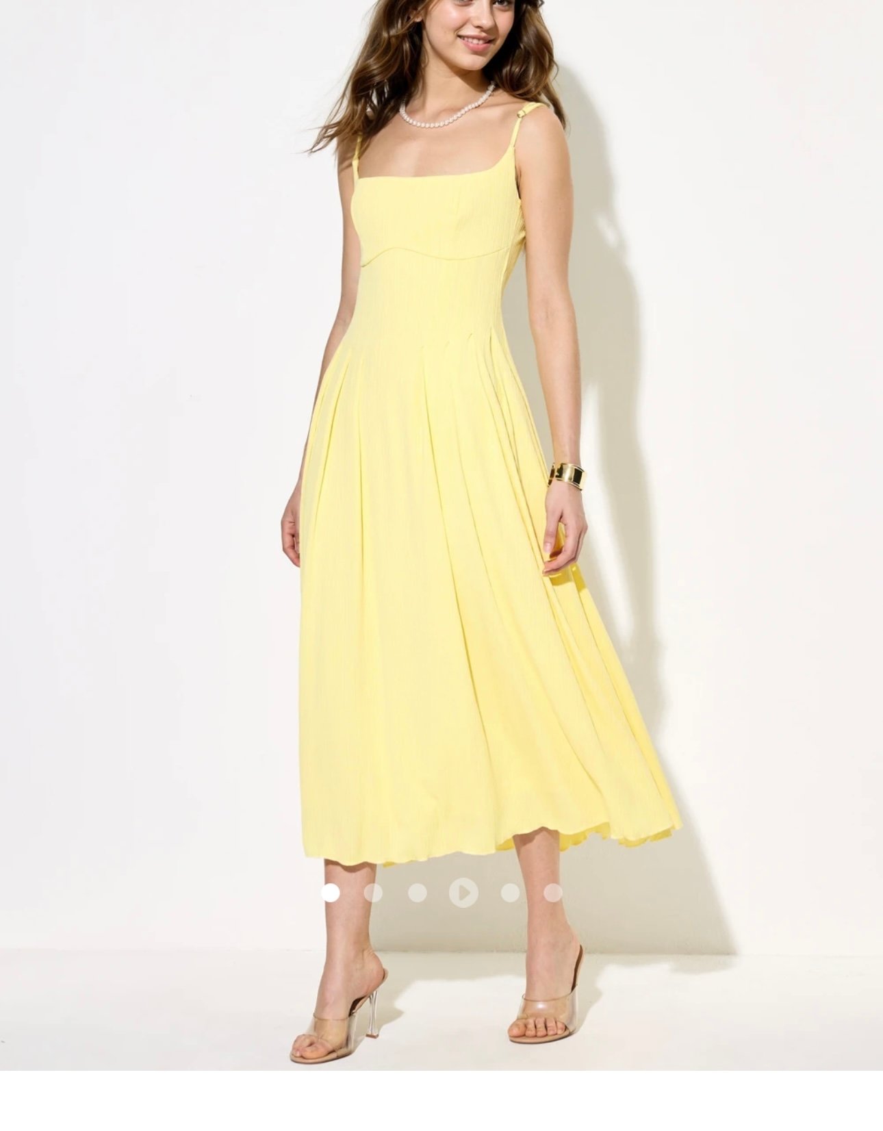 Brighten up any occasion with this Sunshine Yellow Midi Dress, designed to bring charm, elegance, and effortless style to your wardrobe. The soft pleated fabric flows beautifully with every step, while the fitted bodice and square neckline create a flattering, feminine silhouette.